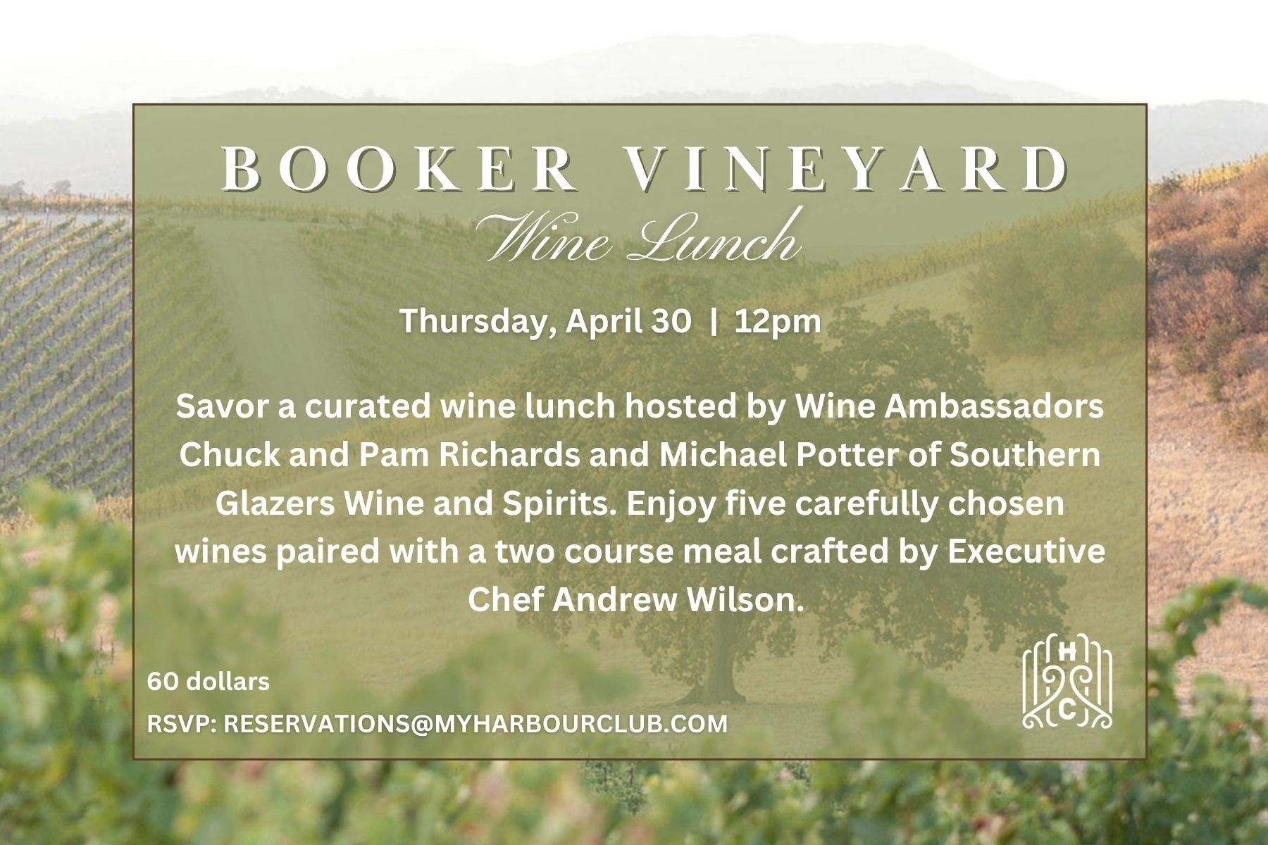 Savor a curated wine lunch hosted by Wine Ambassadors Chuck and Pam Richards and Michael Potter of Southern Glazers Wine and Spirits. Enjoy five carefully chosen wines paired with a two course meal crafted by Executive Chef Andrew Wilson. 60 dollars